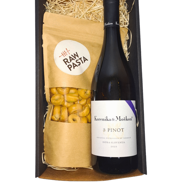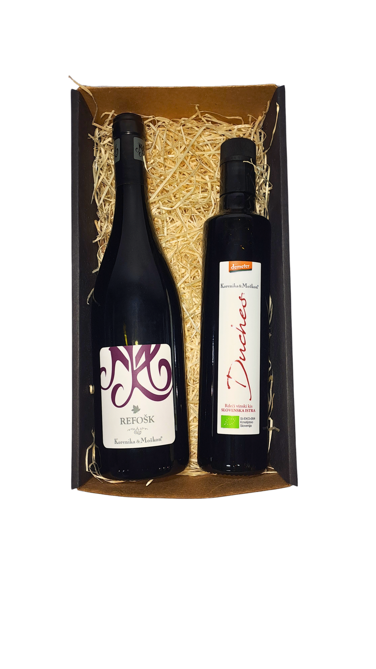 Paket Rustic Refosco Box vsebuje rdeče vino Refošk ter, rdeč vinski kis pridobljen iz Refoška. Domače, personalizirano darilo.